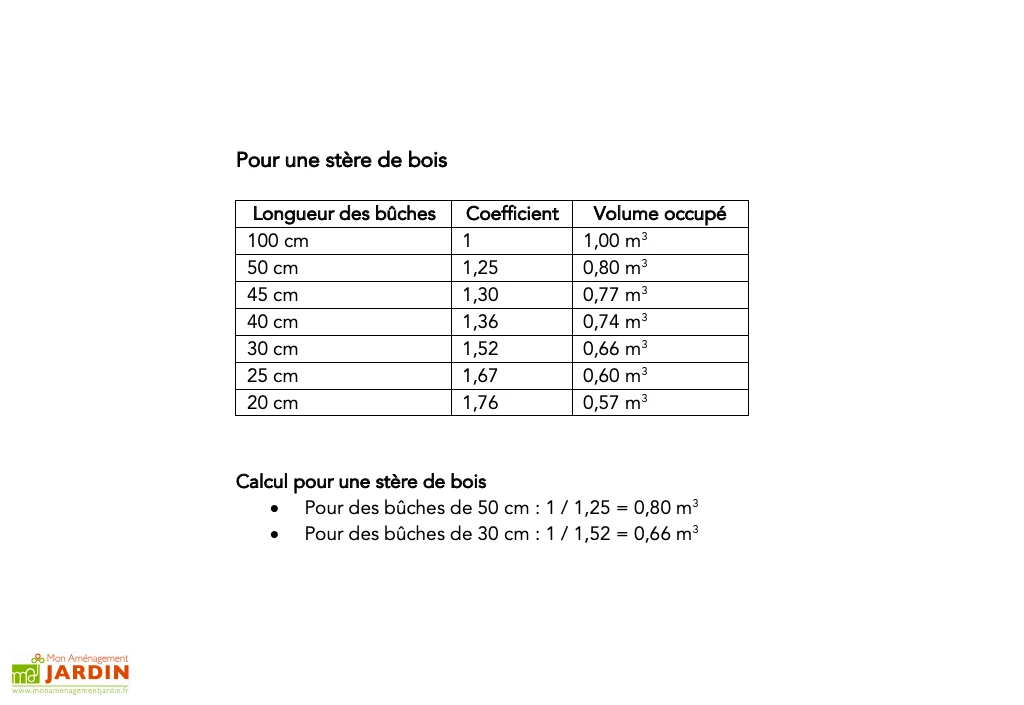Plus les bûches sont petites et moins elles occupent de place. Pour savoir quel volume va occuper votre bois de chauffage il suffit de diviser le nombre de stère par le coefficient correspondant à la longueur de vos bûches. Plus d’info en visuel !
