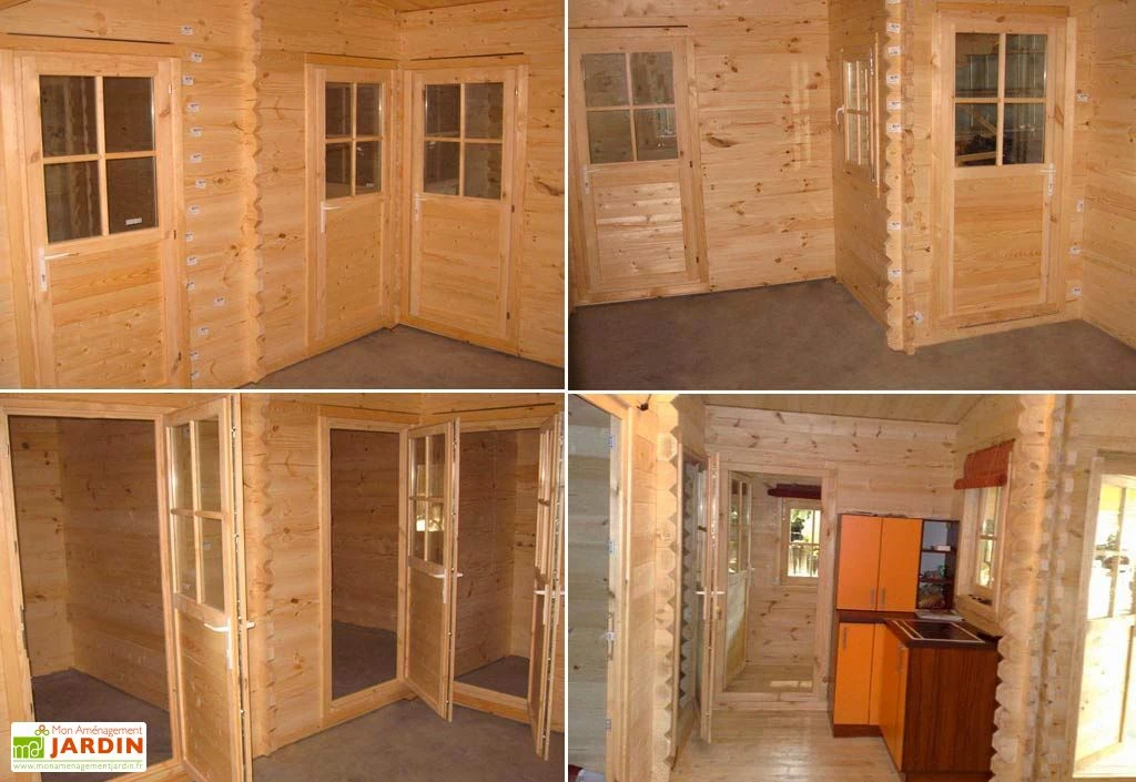 Votre abri de Jardin en bois Fay de 6 x 6 m est fabriqué par Eurovudas Ltd. Ce chalet semi-habitable est constitué de planches robustes en pin nordique de 44 mm d’épaisseur (non peint). Le montage est réalisé par simple emboîtement des planches les unes avec les autres. Votre abri en bois dispose d’une avancée de toit de 1,09 m de longueur sur 1 m de largeur. Sa porte d’entrée en bois semi vitrée avec double vitrage mesure 0,85 x 1,86 m (l, h).