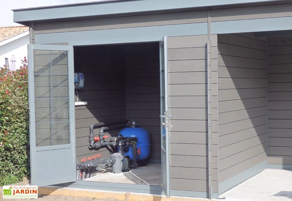 Le cabanon de jardin est fabriqué en aluminium pour les lames de sol, les pannes de toit et la double porte. Les lames qui composent les parois et la toiture sont quant à elles en bois composite gris de 28 mm d’épaisseur. Le bois composite est un mélange de bois (dont 60% est issu de bois recyclé) et de PEHD, un alliage particulièrement résistant aux agressions extérieures.