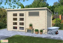 Cet abri de jardin est doté de parois de 34 mm d’épaisseur composées de madriers à emboîter. Ces derniers sont conçus en bois d’épicéa brut, donc non traité. Il vous faudra alors protéger le bois contre l’humidité, la moisissure et les insectes xylophage en traitant toutes les pièces à l’aide d’un insecticide/fongicide et d’une lasure. Le bois utilisé pour la conception du cabanon de jardin est en outre certifié FSC, ce qui signifie qu’il provient de forêts gérées de manière écoresponsable.