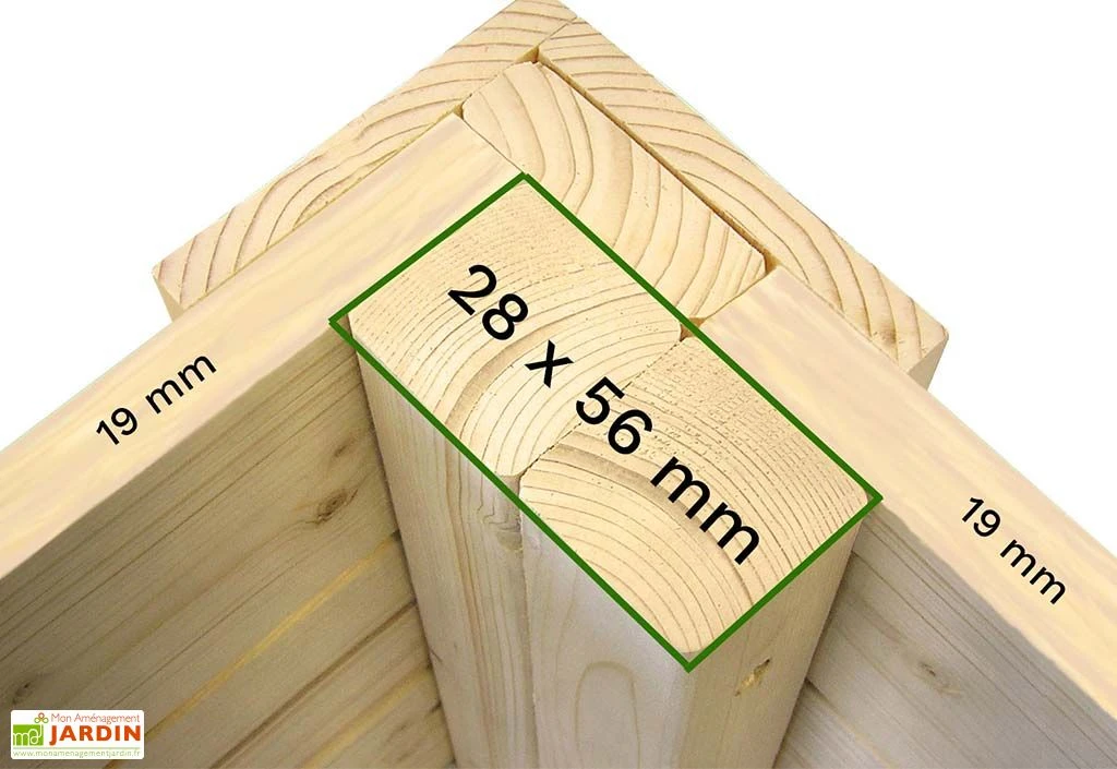 Les parois de 19 mm d’épaisseur de cet abri de jardin en bois soutiennent une toiture monopente en MFP recouverte d’un revêtement en feutre comme première couverture. L’inclinaison de cette toiture permettra par ailleurs d’assurer le bon écoulement des eaux pluviales en cas d’averse. Notez que le toit pourra être incliné vers l’avant ou vers l’arrière, au choix.