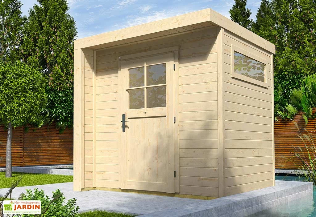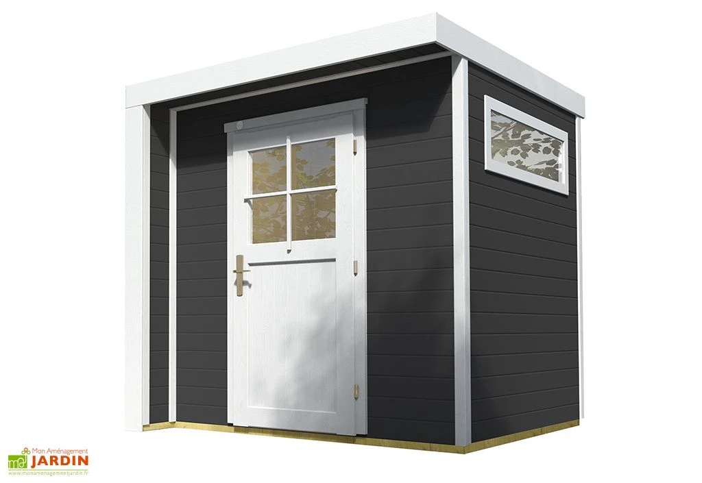 Plus moderne que les cabanons classiques, cet abri de jardin design est disponible en deux coloris, au choix : bois brut naturel et anthracite. Le bois brut devra impérativement être traité afin de le protéger des insectes et de l’humidité susceptibles de le détériorer. Il convient alors d’appliquer un insecticide/fongicide et de lasurer chaque pièce avant de procéder au montage.