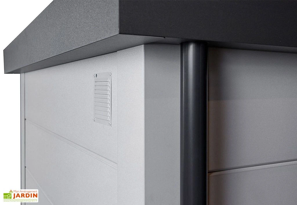 Avec des dimensions extérieures de 2,08 x 2,08 m, ce cabanon de jardin occupera une surface de 4,3 m² une fois installé. Son espace intérieur de 3,2 m² vous permettra de ranger vos équipements d’extérieur, du matériel de jardinage ou des outils, par exemple, à l’abri des intempéries. Les parois de 0,9 mm d’épaisseur intègrent des aérations afin d’assurer la bonne ventilation de l’intérieur de la remise et un plancher est de plus proposé dans l’onglet « Accessoires » afin de mieux protéger le contenu de l’abri des remontées d’humidité ou d’un sol boueux.