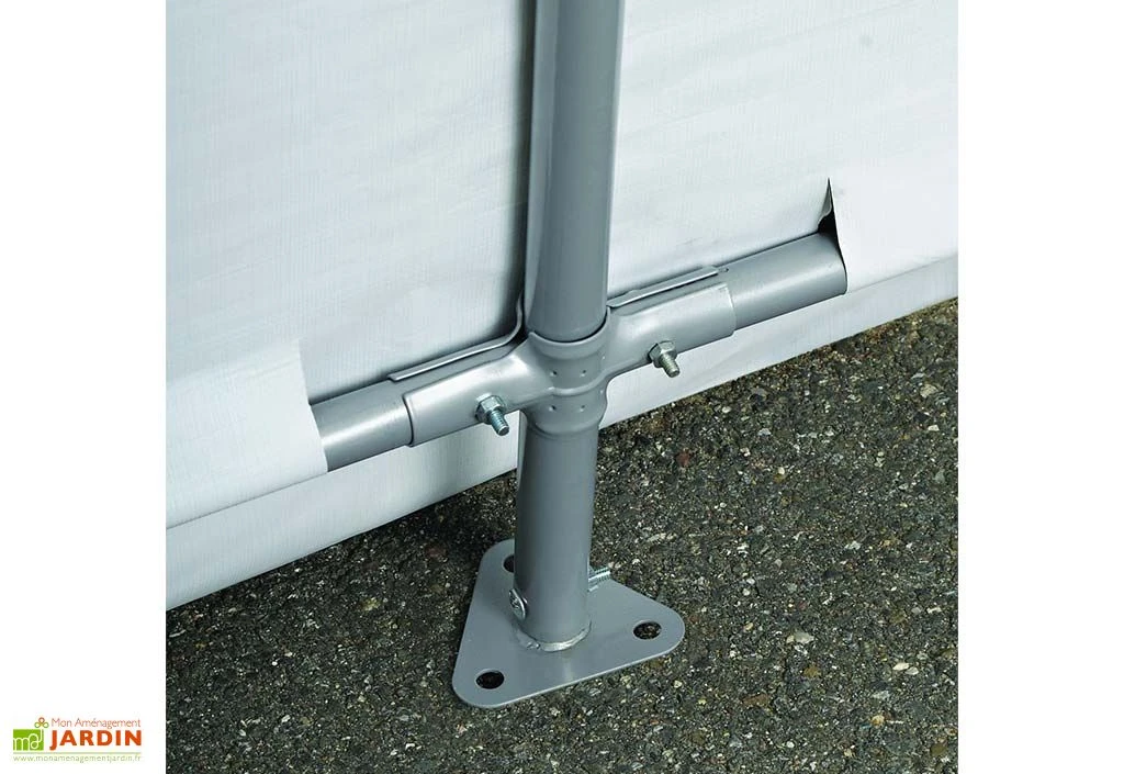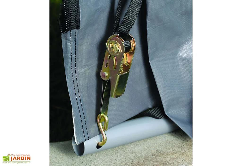 Parfait pour protéger des vélos, une tondeuse à gazon ou autre matériel de jardinage des intempéries, cet abri de jardin en toile pourra être fermé grâce à une porte enroulable de 200 x 180 cm. Il mesure 2,40 x 2,40 m et occupera donc une surface de 5,76 m² une fois monté dans votre jardin. Notez que cet abri souple devra être installé sur une surface plane et qu’il devra être fixé au sol grâce aux quatre ancrages fournis. Huit sangles d’arrimage sont également incluses. Elles permettront d’attacher la bâche à la structure.