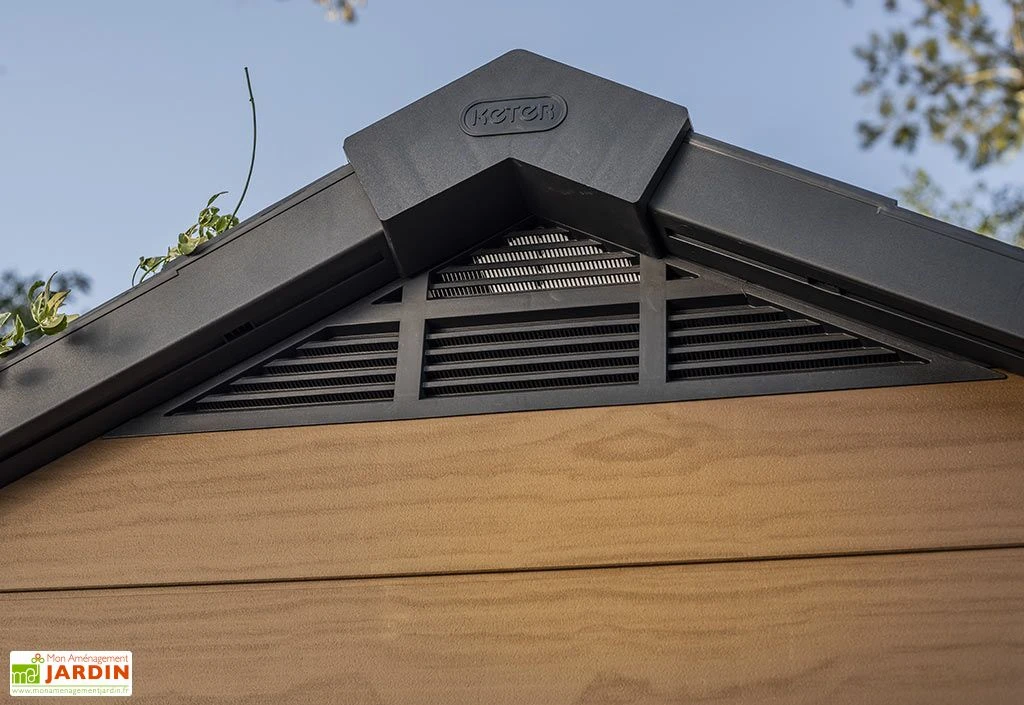 La maison de jardin imitation bois est aussi étanche, protégée contre les UV et ne craint pas la moisissure ni les insectes. Sans entretien, l’abri ne rouille pas, ne s’abime pas et ne s’écaille pas. Des aérations permettent de ventiler facilement l’intérieur de l’abri.