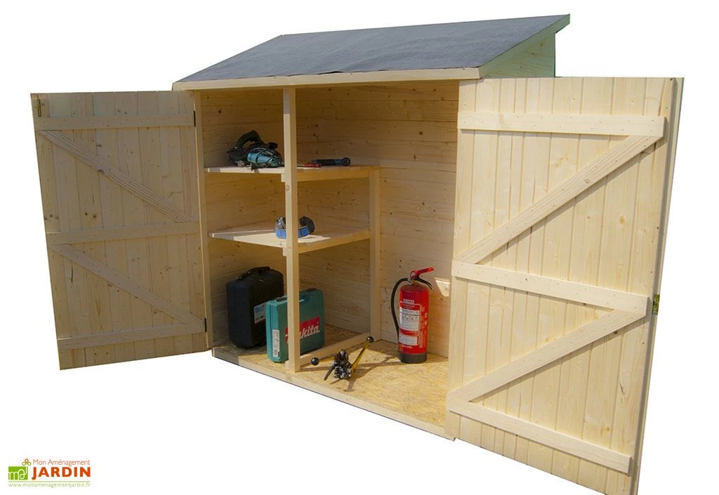 L’armoire de rangement de chez Habrita est en épicéa massif non traité. Elle mesure 72 cm de profondeur, 175 cm de largeur et 174 cm de hauteur. Elle est équipée d’une grande double porte. Chaque porte mesure 76 cm de largeur et 137 cm de hauteur. Les parois possèdent une épaisseur de 16 mm. Elles sont en panneaux pré-montés de planches rabotées et dispose d’un cadre de section 25 x 25 mm. L’armoire de jardin dispose d’un plancher inclus en panneaux de particules traités de 12 mm d’épaisseur. L’armoire est certifiée PEFC et dispose de 2 étagères de rangement. La toiture est recouverte avec de la toile bitumée. La garantie est de 2 ans.