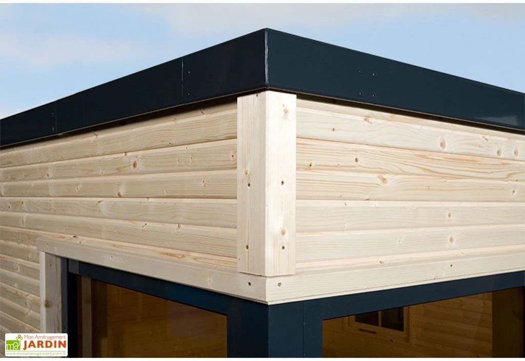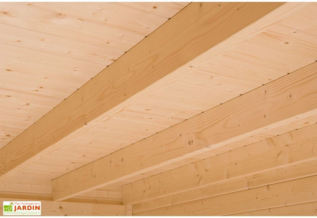 Une des parois du bungalow en bois est vitrée grâce à la porte et 3 fenêtres de 1,88 m de hauteur et de 86 cm de largeur. Il dispose également d’une fenêtre oscillo-battante. Un plancher en bois massif de 19mm d’épaisseur est également compris dans la livraison. Le toit du bungalow est en bois de 19 mm d’épaisseur. Il est recouvert d’un film le protégeant de la pluie et d’un profilé de finition en aluminium.