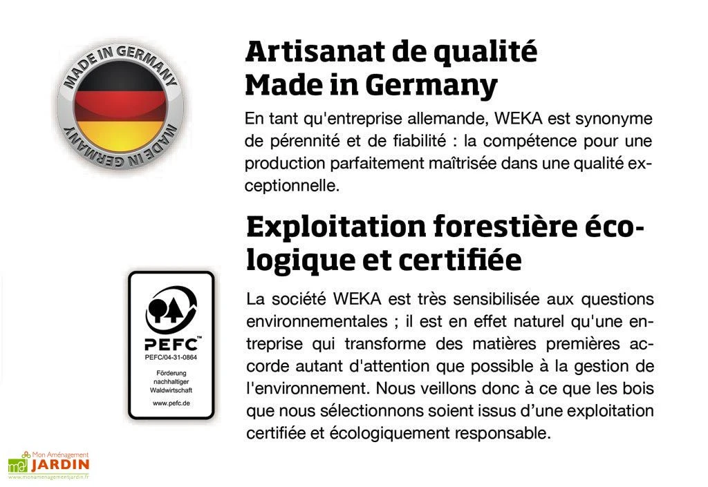 Votre carport PLUS de chez Weka a une structure en pin polonais (FSC) imprĂ©gnĂ© en autoclave (IAC). L’abri, directement importĂ© d’Allemagne, est constituĂ© de poteaux de sections de 90 mm sur 90. Le carport inclus le local Ă outils et ou garage Ă vĂ©los. Le toit du carport est en PVC de couleur grise. Il est fixĂ© au moyen de vis de plombier en inox avec rondelles de joint moulĂ©es et cales d’espacement qui Ă©vitent l’Ă©crasement de la plaque sur la poutre. Le carport a une largeur de passage de 2,70 m de chaque cotĂ© et une hauteur de passage de 2,15 m. Il bĂ©nĂ©ficie d’une surface de 21,30 mètres carrĂ©s. Le carport rĂ©siste Ă 125 Kg/m² de neige. Le carport Weka est livrĂ© en kit avec une notice de montage dĂ©taillĂ©e. Les accessoires (ancrage en H, parois latĂ©rales, local Ă outil) et dĂ©coration ne sont pas fournis. Weka garantit votre carport 5 ans sur toutes les pièces en bois et 2 ans pour le reste.