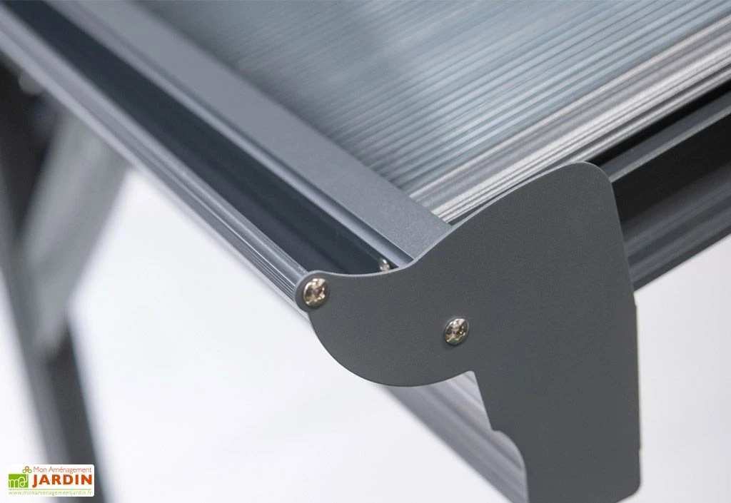 Bonne alternative aux garages de jardin, ce carport permet un stationnement tout aussi simple, notamment grâce à sa largeur de passage de 2,76 m. Il affiche une hauteur de passage de 1,92 m et compte six poteaux. Sa structure en aluminium se montrera particulièrement résistante face aux intempéries et autres agressions extérieures et ne rouillera pas, l’aluminium étant un matériau insensible à la corrosion. Sa finition anthracite lui permettra de plus de s’intégrer facilement dans n’importe quel type d’extérieur.