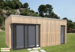 L’abri de jardin ou Bungalow Design Studio (395×375) de chez M² Espace Jardin en ossature bois de haute qualité environnementale et thermique (le coefficient thermique de la toiture est R = 5,40 M2 K/W et celui des murs : R = 3,75 M2 K/W), vous permet de profiter de votre jardin tout au long de l’année ou d’agrandir votre maison d’une pièce supplémentaire à moindre frais. Le studio en construction bois issu de forêts gérées durablement est parfaitement isolé avec de la laine de roche de 140 mm d’épaisseur (un devis en laine de bois peut vous être adressé. Contactez-nous !). Les différentes caractéristiques du bungalow lui permettent de répondre aux exigences de la norme RT 2012.