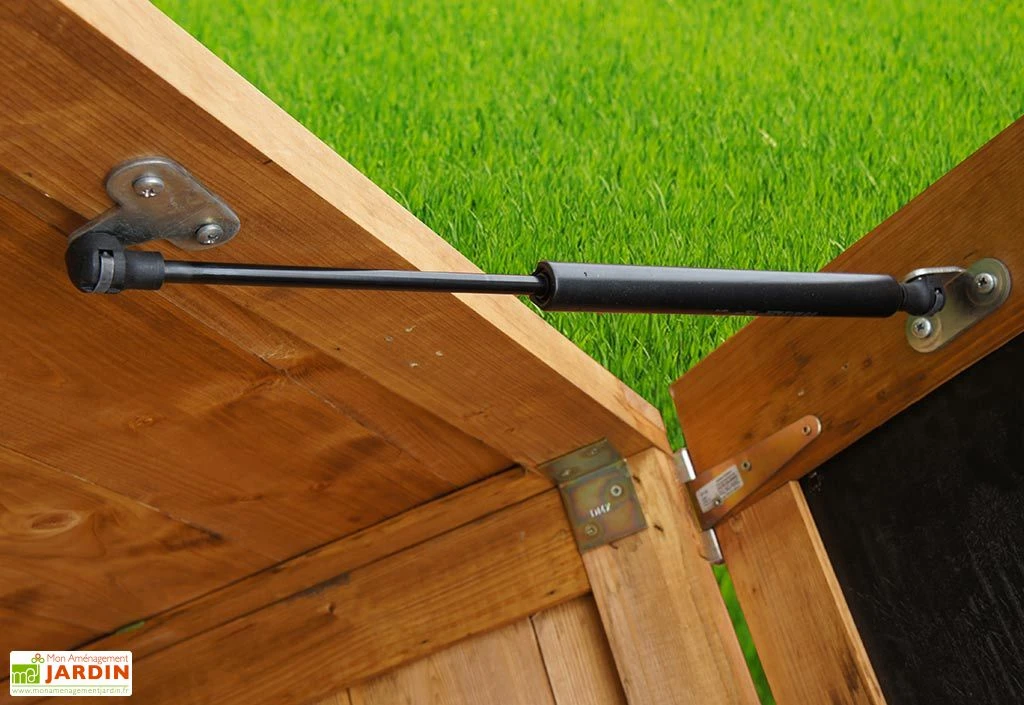 Le coffre peut disposer de plusieurs usages : local technique pour la piscine, cache poubelles pour poubelles de 120 L max, coffre de rangement pour le mobilier et les équipements de jardin… L’ouverture des portes mesure 141 x 105 cm. Il est livré avec son plancher et dispose de vérins à gaz qui permettent de maintenir le couvercle ouvert. Le coffre se monte facilement à l’aide d’une notice de montage détaillée en Français. La garantie est de 2 ans.