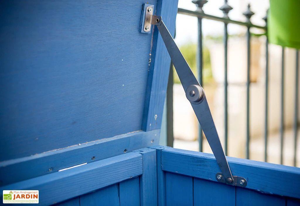 Ce coffre de jardin vous permettra donc de ranger vos outils, matériel de jardinage ou vos accessoires de salon de jardin, par exemple. Il est doté d’un couvercle équipé de deux équerres pour son ouverture et sa fermeture. Facile à monter, ce coffre de rangement est livré en kit et est déjà traité, notamment contre les intempéries. Il bénéficie en effet d’une lasure de couleur bleue lui offrant une belle résistance à l’eau. Ce coffre ne demandera donc que très peu d’entretien.