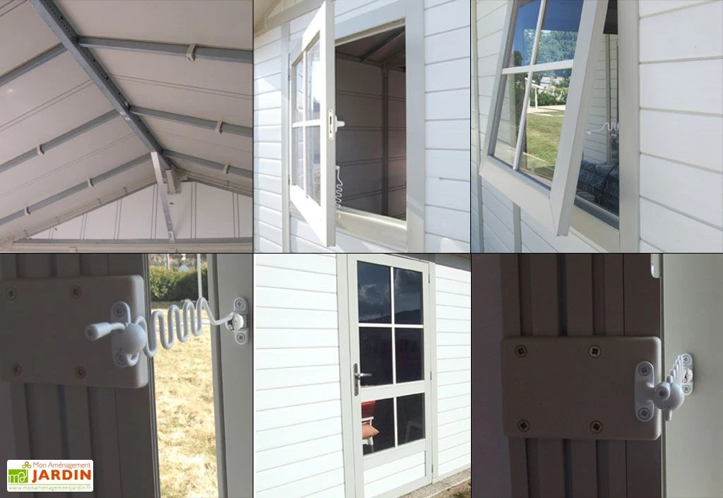 La porte double de l’abri de jardin mesure 1,45 x 1,80 m (l,h) et possède des vitres de 56,2 x 59,5 cm (l,h). L’abri a également une lucarne sur le côté de 68,2 x 60,9 cm (l,h). L’abri est livré avec son kit de fixation, une poignée et une serrure à clé. Il doit être installé sur une dalle de béton de 10 cm d’épaisseur minimum.