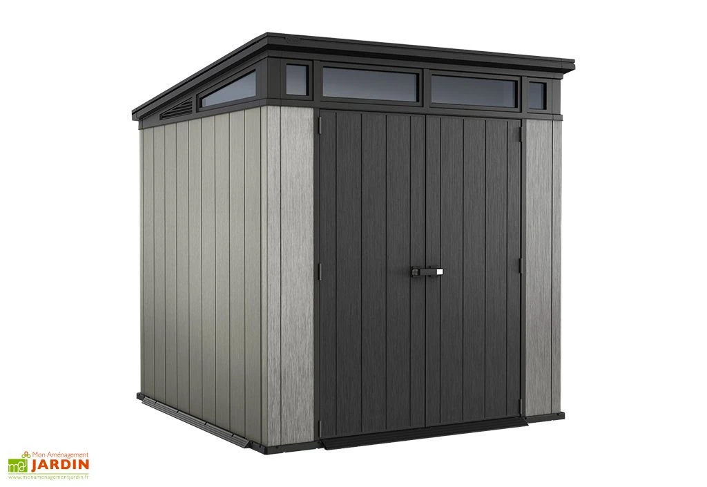 L’abri de jardin carré mesure 2,18 m de longueur et de largeur et 2,26 m de hauteur (dimensions hors tout) pour une surface de 4,75 m². Il dispose d’une toiture une pente vers l’arrière imitant les tuiles en 3 dimensions. La toiture est en polypropylène et peut supporter jusqu’à 125 kg/m² de neige.
