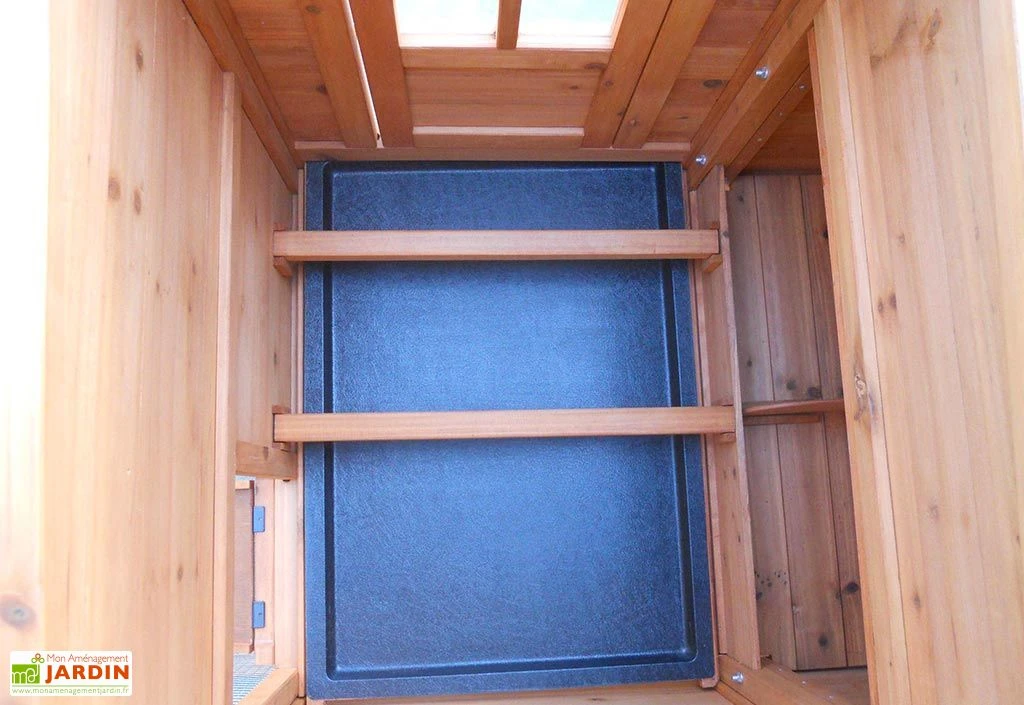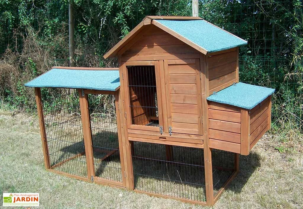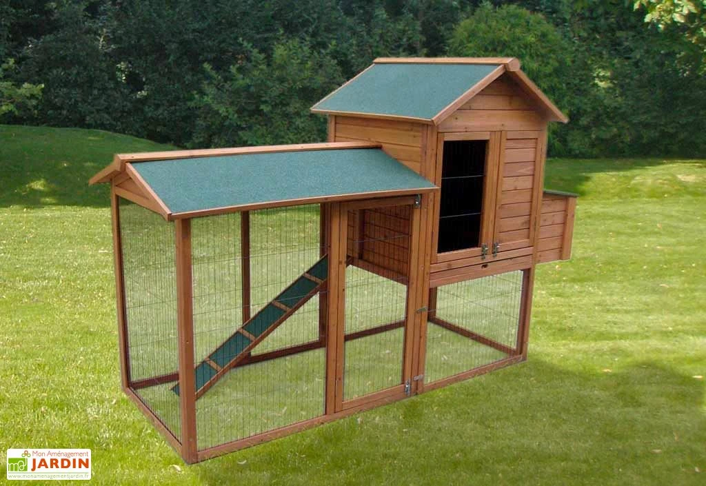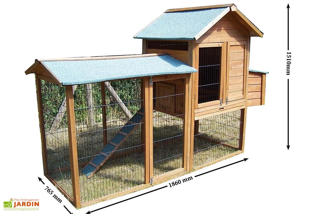 Le poulailler dispose d’une rampe d’accès, de deux perchoirs et trois portes permettant d’accĂ©der facilement aux 2 espaces. Le toit est recouvert d’un feutre bitumĂ©. Les dimensions extĂ©rieures hors tout sont : 227 x 94 x 151 cm (l,l,h). Les dimensions intĂ©rieures au sol sont : 186 x 70 x 151 cm (l,l,h).Â